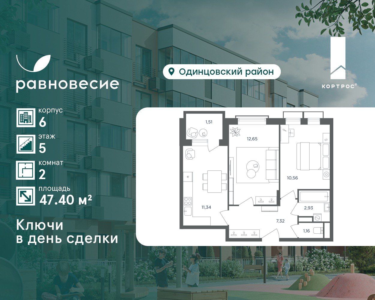 Продаётся квартира с 2 комнатами общей площадью 47.40 кв. метров на 5 этаже жилого квартала комфорт-класса ''Равновесие''.