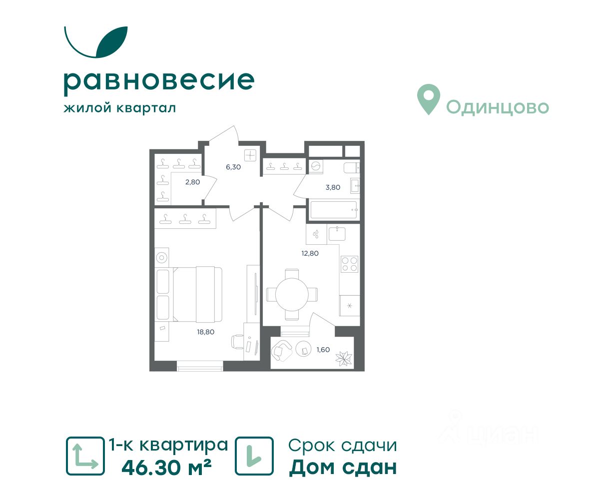 Продаётся квартира с 1 комнатой общей площадью 46.30 кв. метров на 5 этаже жилого квартала комфорт-класса ''Равновесие''.