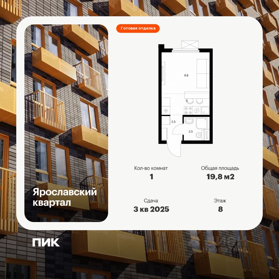 Продаётся квартира-студия площадью 19,8 кв.м на 8 этаже 25 этажного дома (Корпус 1.2, Секция 1) проекта ПИК Ярославский квартал. Светлый просторный подъезд на уровне земли, функциональная планировка, большие окна, c отделкой.