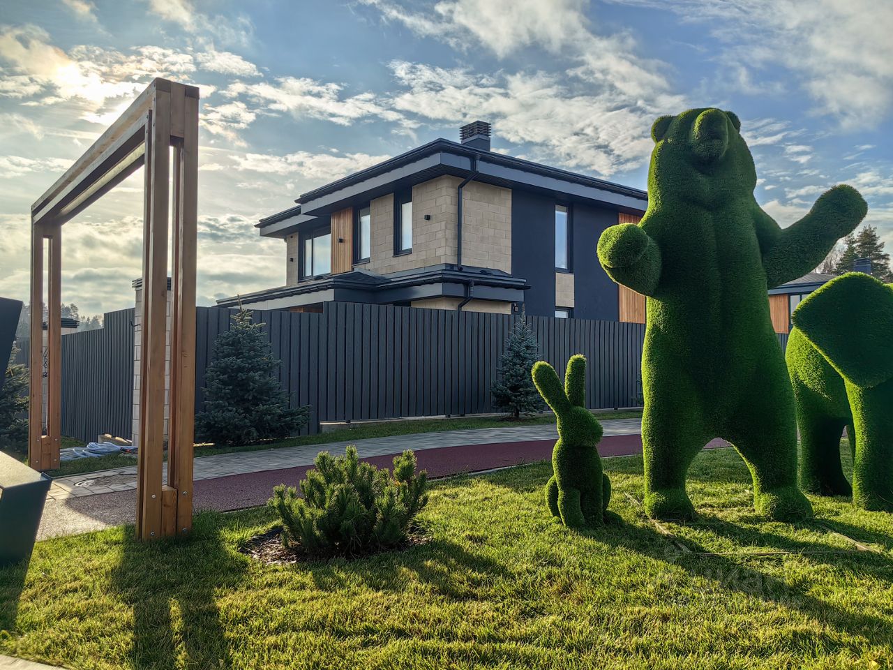 Фасад: декоративный камень White Hills, вставки планкен и декоративная штукатурка Ceresit.
