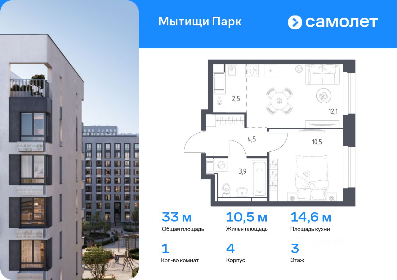 Предлагается 1-комнатная квартира комфорт-класса 33 кв.м в корпусе 4 на 3 этаже, в ЖК ''Мытищи Парк'' Квартира с чистовой отделкой. Доступность дополнительных опций уточняйте у застройщика.
