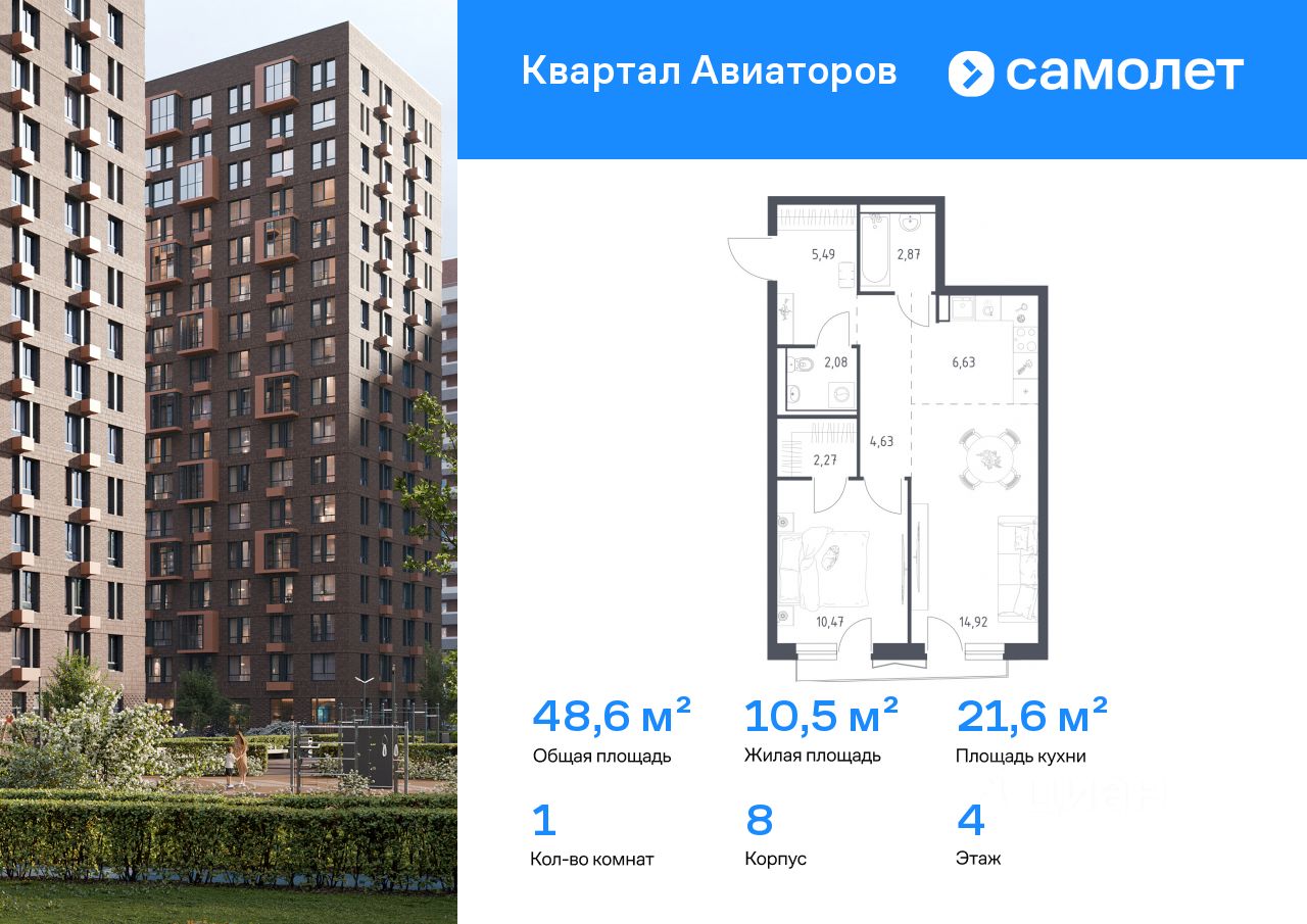 Предлагается 1-комнатная квартира комфорт-класса 48,6 кв.м в корпусе 8 на 4 этаже, в ЖК ''Квартал Авиаторов''