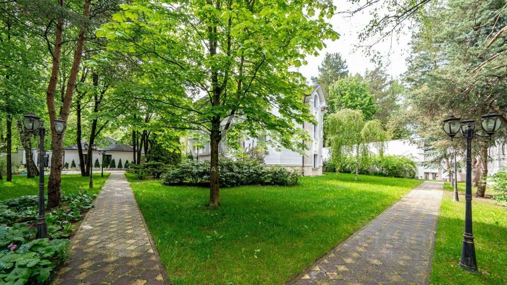 На участке правильной формы выполнен красивый ландшафтный дизайн. Аккуратно уложен газон, сделаны дорожки и уличное освещение. Участок утопает в зелени, а из окон открывается сказочный вид на собственный лес. Предусмотрена система автополива. Для дополнительной безопасности по периметру установлены датчики охраны и камеры.