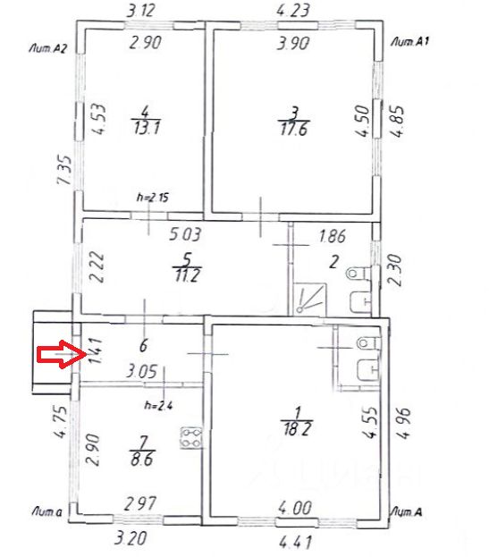 Дом состоит из трех изолированных комнат (13,1 кв.м., 17,6 кв.м. и 18,2 кв.м.), кухни (8,6 кв.м.), двух совмещенных санузлов и одной проходной комнаты (11,2 кв.м.).