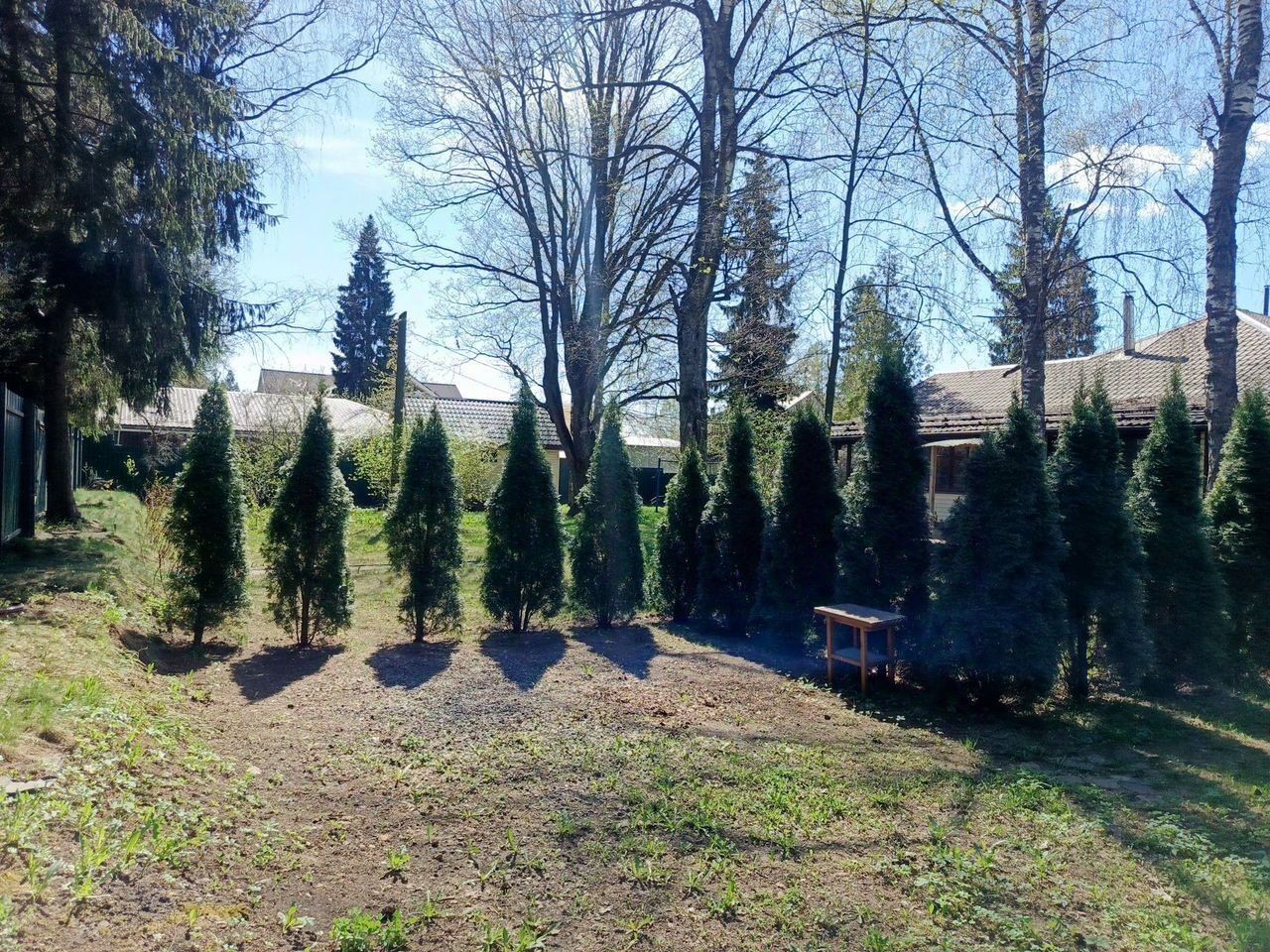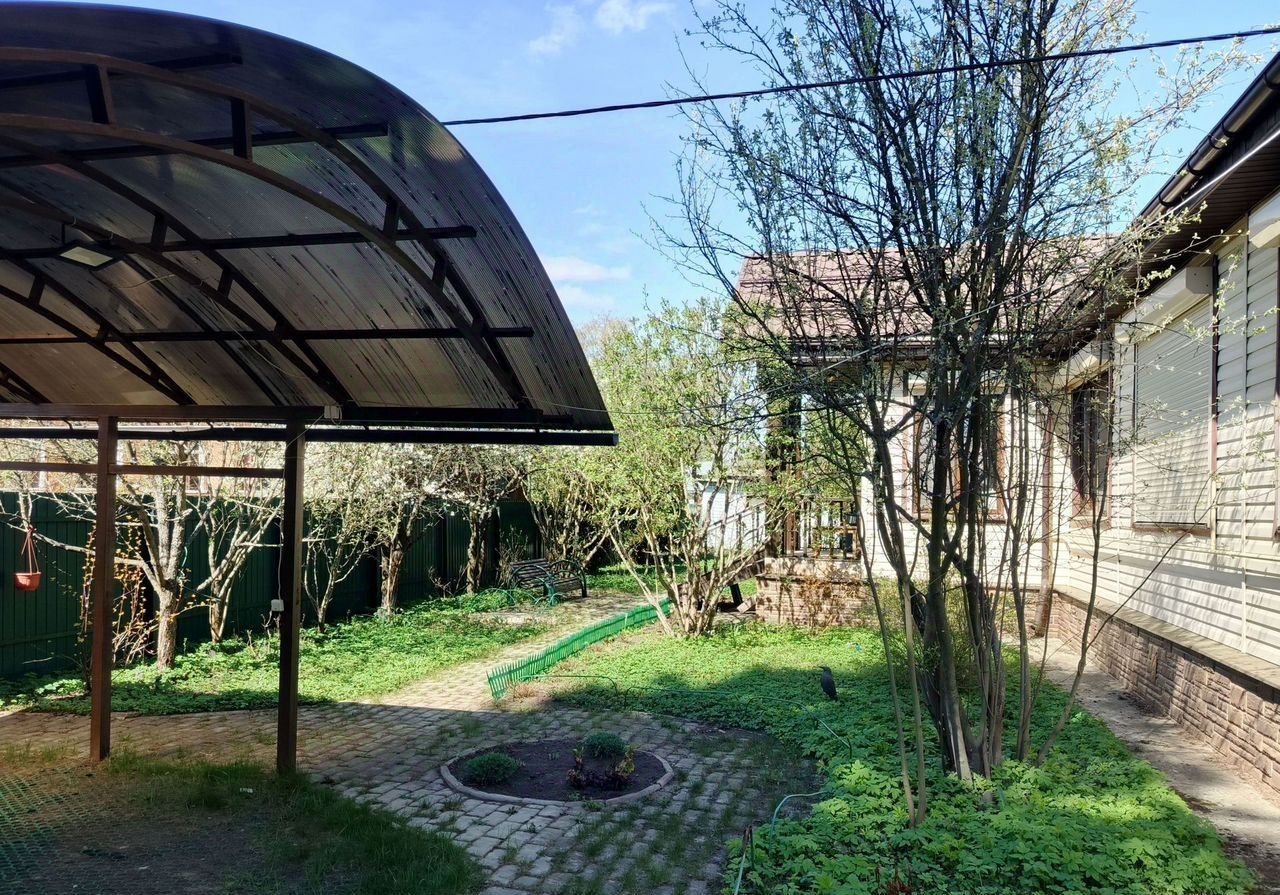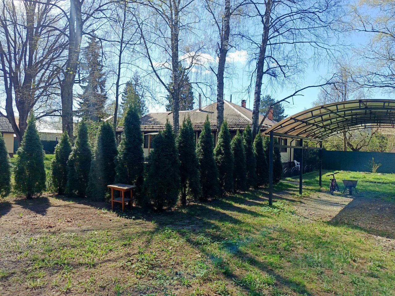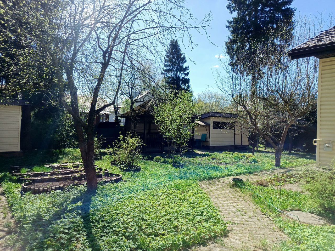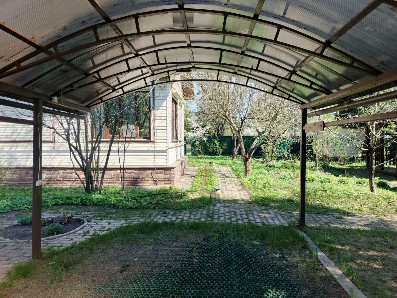 Дом окружен соседями с трех сторон, по границе железный забор, дорога - асфальт. На участке расположены два навеса для машины, несколько хозблоков, колодец, беседка, детская площадка.