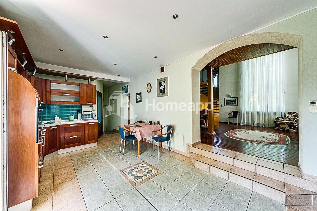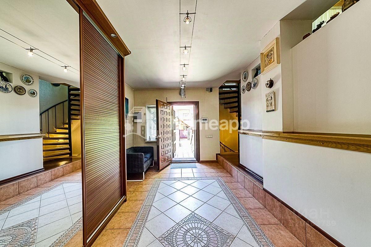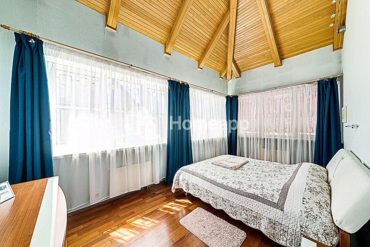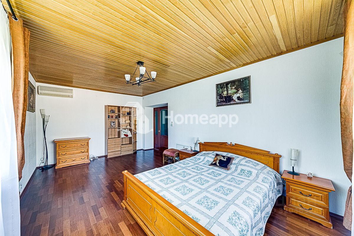 В доме 4 уровня. Цокольный этаж: фитнес-зал, кинозал, бойлерная, подсобная комната, баня-сауна с парогенератором, комната отдыха. 1 этаж: кухня с выходом в сад, гостиная со вторым светом, гостевой с/у с постирочной, теплый гараж с мастерской. 2 этаж: 2 спальни, гардеробная, с/у с душевой, галерея с библиотечной зоной. 3 этаж: 1 спальня, большая игровая, гардеробная, с/у с ванной. Отделочные материалы качественные, натуральные: на полу дубовый паркет, стены ровные с обоями под покраску, хорошая сантехника и смесители (Германия), кухня из натурального дерева (Италия), на мансардном этаже отделка деревом - горная ольха и дуб. Дом полностью меблирован хорошей итальянской мебелью. Достаточно мест хранения и встроенных шкафов в комнатах. Высота потолка - 3м.