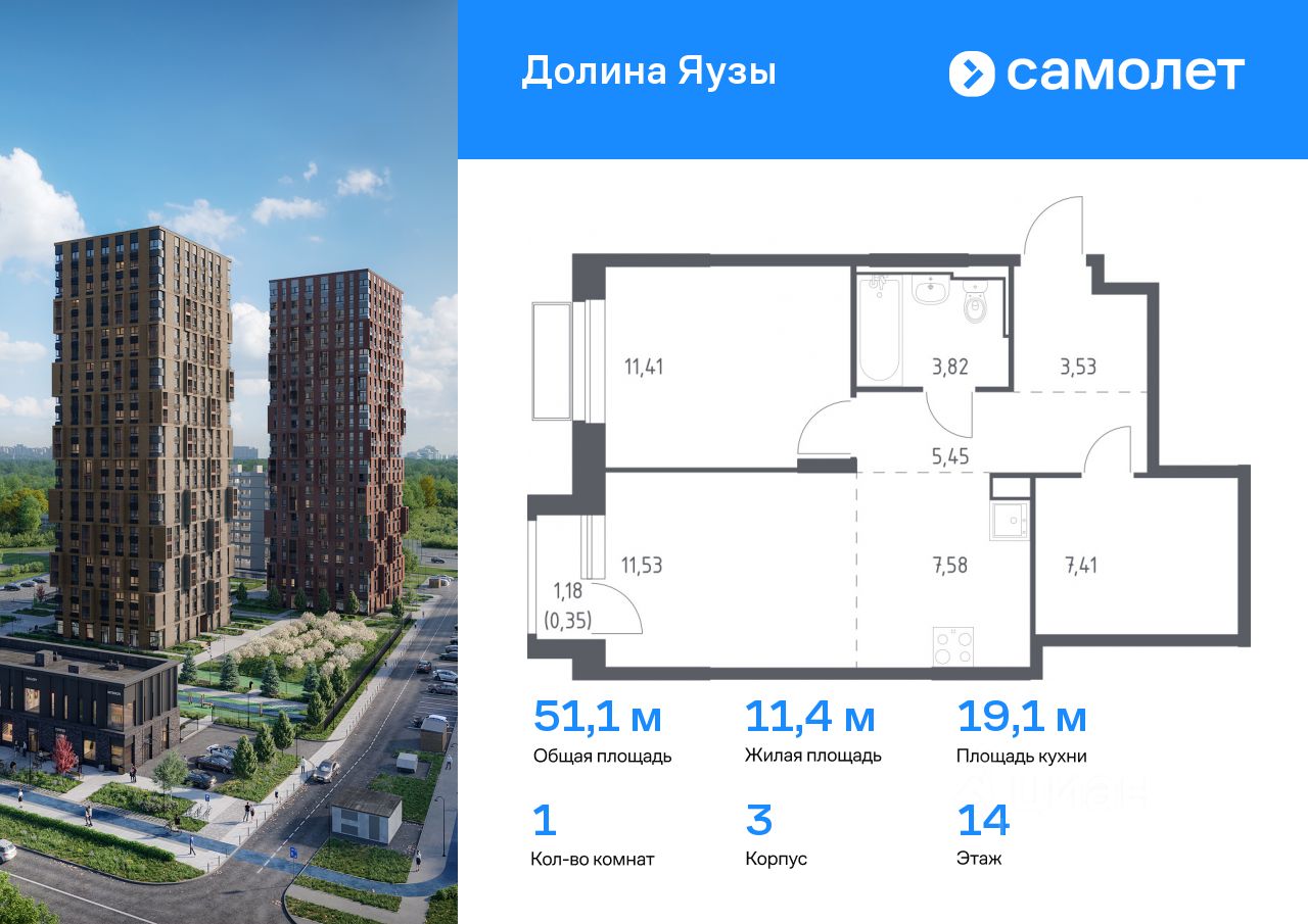 Строим кварталы для жизни с заботой о будущем. Предлагается 1-комнатная квартира комфорт-класса 51,08 кв.м в корпусе 3 на 14 этаже, в ЖК ''Долина Яузы'' Квартира с чистовой отделкой. Доступность дополнительных опций уточняйте у застройщика.