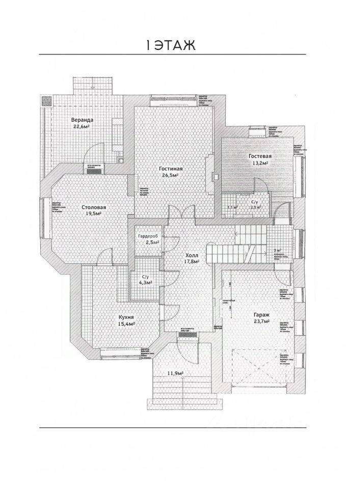 На первом этаже расположены: гостиная 26,5 м² с высокими потолками (8 метров) и камином, столовая 19,5 м² с выходом на веранду и доступом к заднему двору, кухня 15.4 м², оборудованная всей необходимой бытовой техникой, гостевая комната 13,2 м², гардеробная, два санузла, а также гараж 23,7 м², с двумя выходами, в дом и во двор.