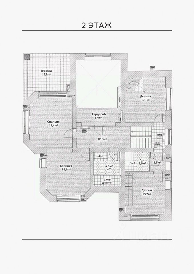 На втором этаже расположены: спальная комната 19,4 м², с выходом на просторную террасу 17,2 м², две двухуровневых детских комнаты 17,1 м² и 15,7 м², гардеробная, два санузла, а также рабочий кабинет 18,6 м².
