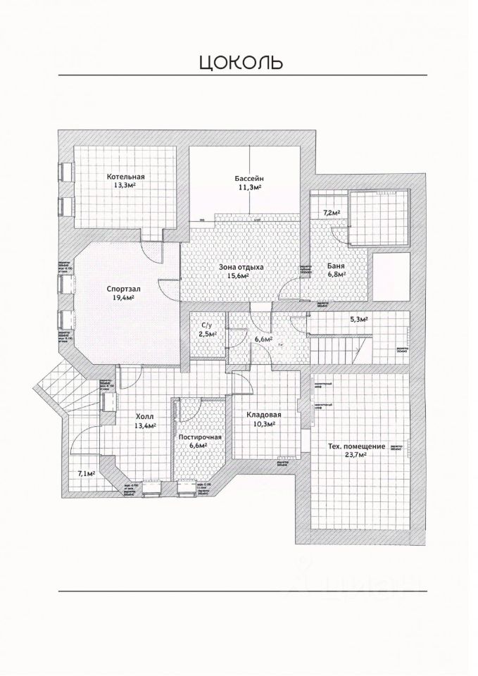 На цокольном этаже расположена зона отдыха, включающая в себя: бассейн 4х3, финскую сауну 14 м², спортивный зал 19,4 м², санузел, кладовую 10,3 м², постирочную 6,6 м² и котельную комнаты.