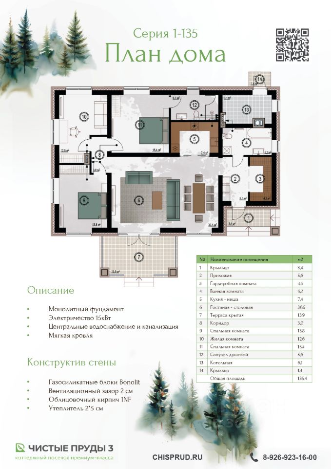 Чистые Пруды-3 — территория уверенного будущего, комфорта и качественного домостроения. О коттедже: - 3 спальни ( 13,8 кв.м, 12,6 кв.м., 15,4 кв.м), - гостиная-столовая (36,5 кв.м.), - 2 санузла, - терраса (13,9 кв.м.) Коттедж в базовой комплектации включает в себя: ограждение участка по периметру, асфальтированный заезд с калиткой и воротами фундамент - монолитная плита стены из газосиликатного блока с утеплителем в два слоя и облицовочным кирпичом гибкую черепицу с водосточной системой и снегозадержателями подшивку свесов кровли по периметру шириной 1 м бетонную отмостку шириной 1 м по периметру внутренние перегородки монолитное перекрытие подведенное водоснабжение, канализацию и электричество 15 кВт ________________________________________ Дополнительные расходы: Газификация дома Подготовка оконных проемов и установка окон/дверей Подшивка свесов кровли над террасами и крыльцами Черновые полы под отметку заказчика
