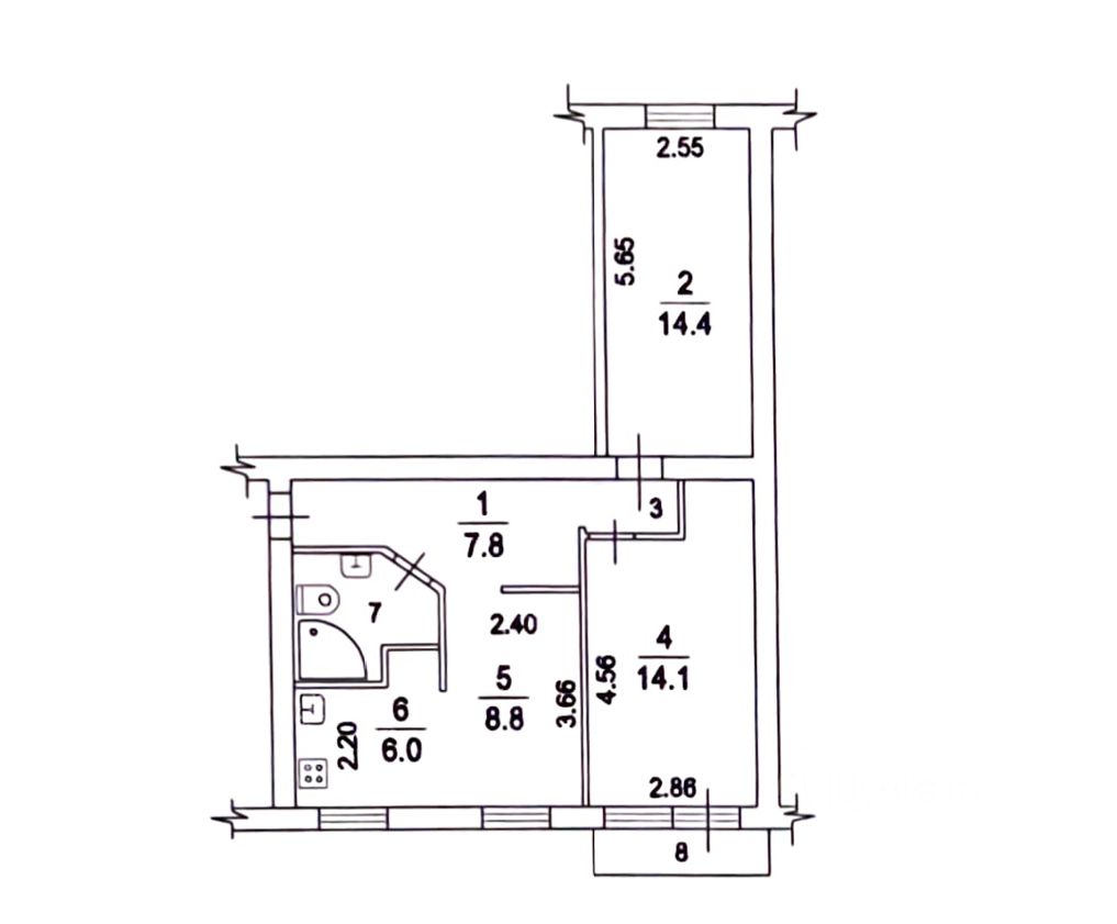 Квартира общей площадью 57,4 кв.м., жилая площадь 37,3 кв.м., кухня 6 кв.м., объединенная с гостиной 8.8 кв.м. (кухня-гостиная 15 кв.м.) комнаты 14,1 и 14,4 кв.м. изолированные, окна выходят на две стороны дома, санузел совмещенный, прихожая 7,8 кв.м. Ремонт производился в 2025 году с заменой разводки электрики и водоснабжения.