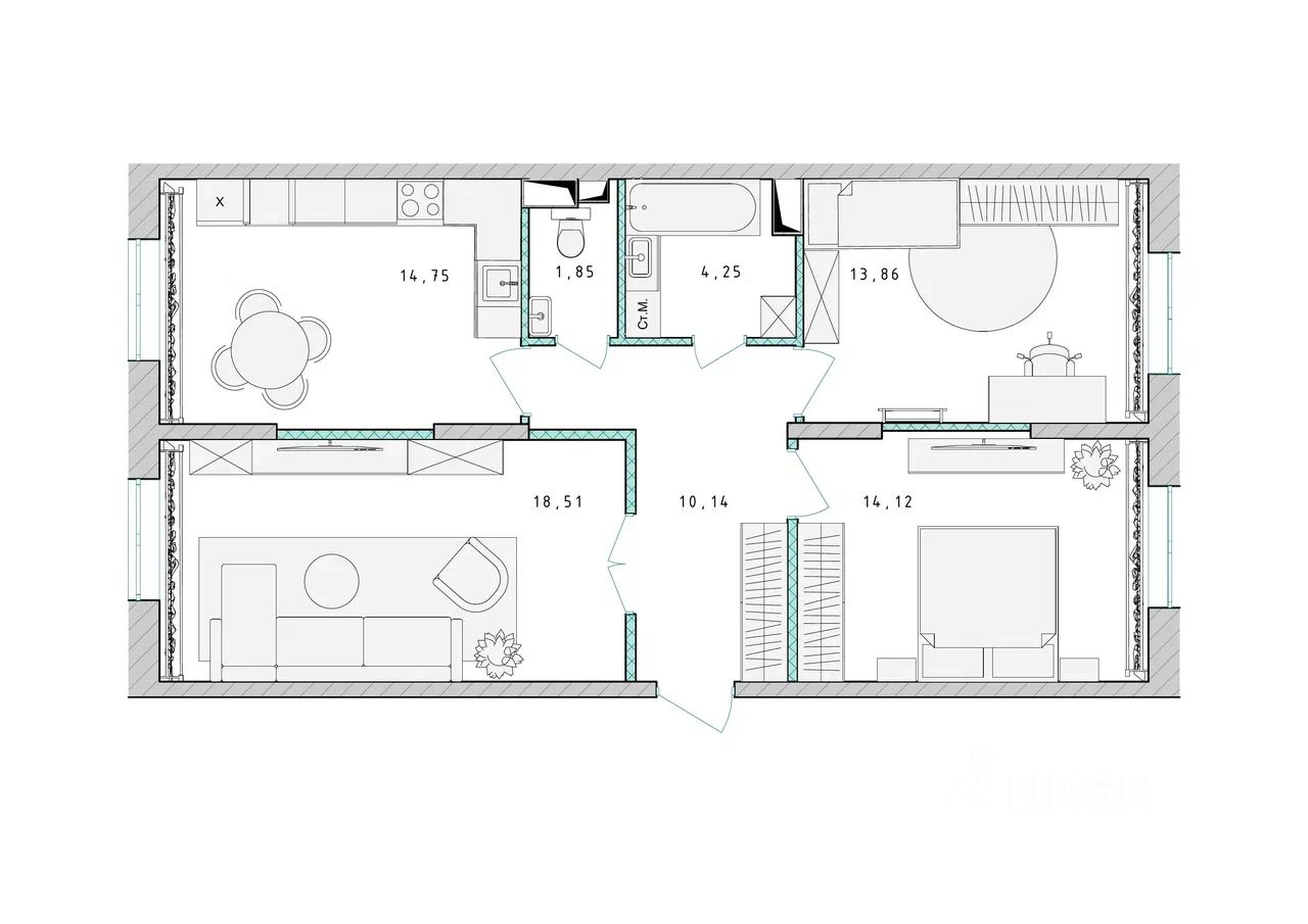 Продаётся 3-комнатная квартира в сданном доме (Корпус 1), срок сдачи: 4-кв. 2023, общей площадью 77.30 кв.м., на 8 этаже.