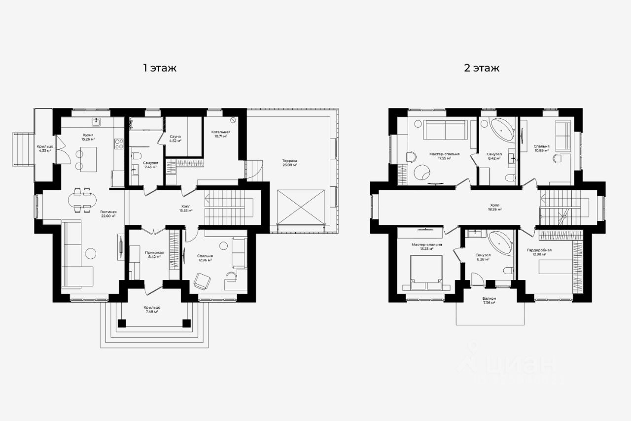 Участок 12 соток. Планировка: 4 спальни и 3 санузла.