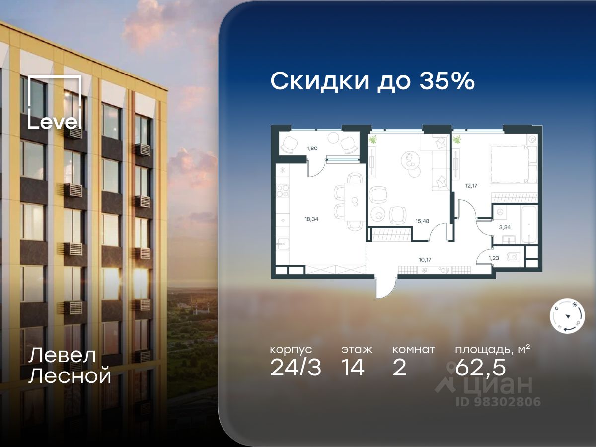 В районе, утопающем в густой зелени лесов, многочисленных парков и скверов, продаётся 2-комнатная квартира площадью 62.50 кв.м с отделкой white box. Квартира расположена на 14 этаже в жилом комплексе комфорт-класса Левел Лесной (компания Level Group/Левел групп).