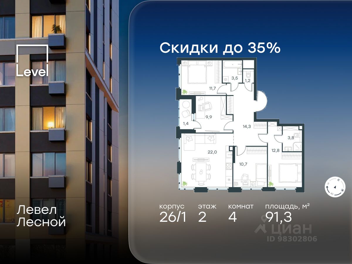 В районе, утопающем в густой зелени лесов, многочисленных парков и скверов, продаётся 4-комнатная квартира площадью 91.30 кв.м с отделкой white box. Квартира расположена на 2 этаже в жилом комплексе комфорт-класса Левел Лесной (компания Level Group/Левел групп).